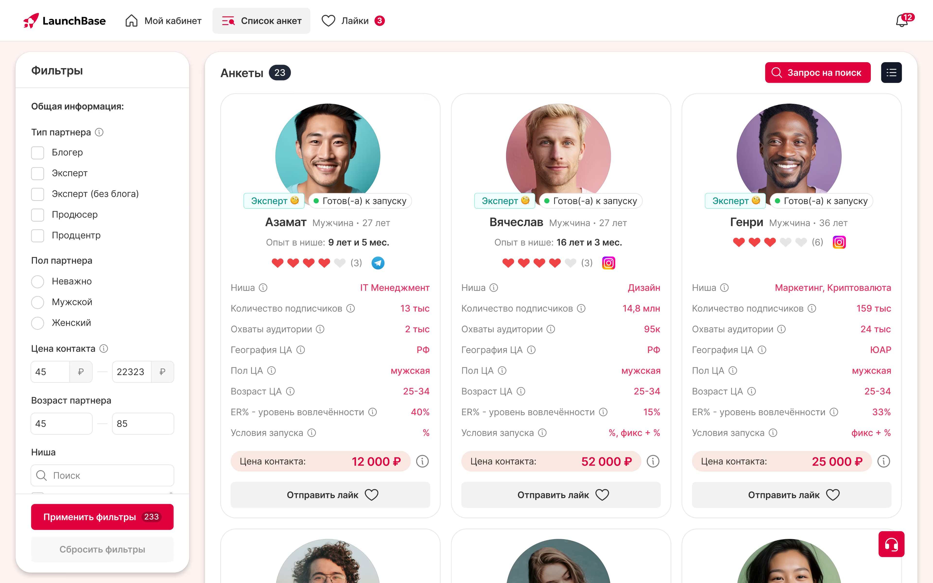 У каждого блогера, эксперта и продюсера своя уникальная анкета — опыт запусков, цели, условия сотрудничества и многое другое — каждая анкета проходит строгую модерацию, мы гарантируем защиту и достоверность данных.